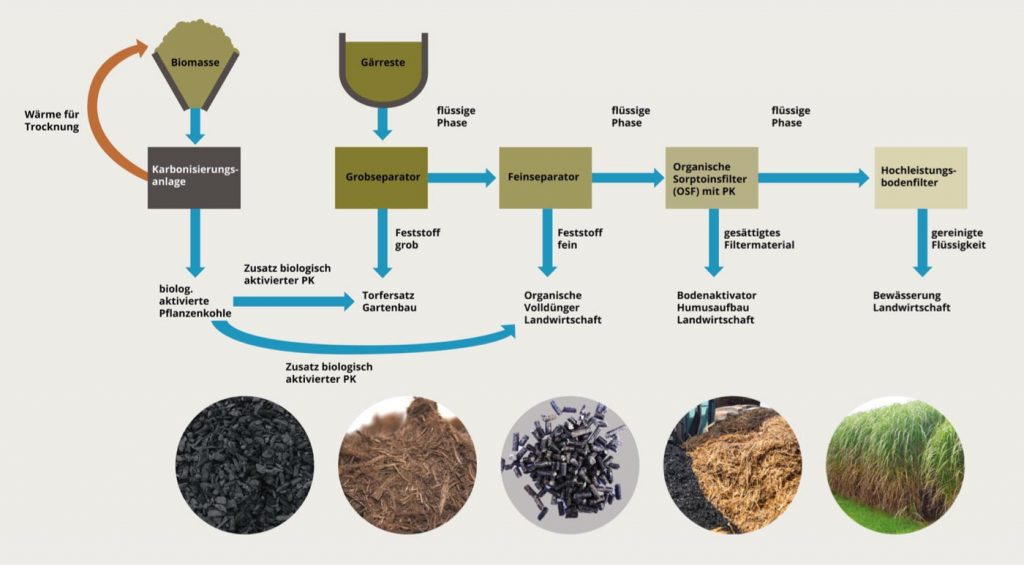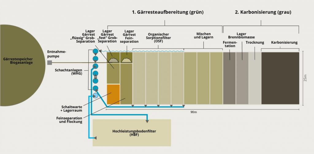 Das ricionG2H-Verfahren besteht aus 4 Behandlungsstufen, nämlich der Grobseparation, der Feinseparation dem OSF und einem HBF. Hier werden die flüssigen Gärreste zu handelsfähigen Produkten auf ricionterra-Basis weiterveredelt. Optional kann der Standort zusätzlich mit einer Karbonisierungsanlage ausgestattet werden, um weitere Synergien und Wertschöpfungspotenziale zu ermöglichen.