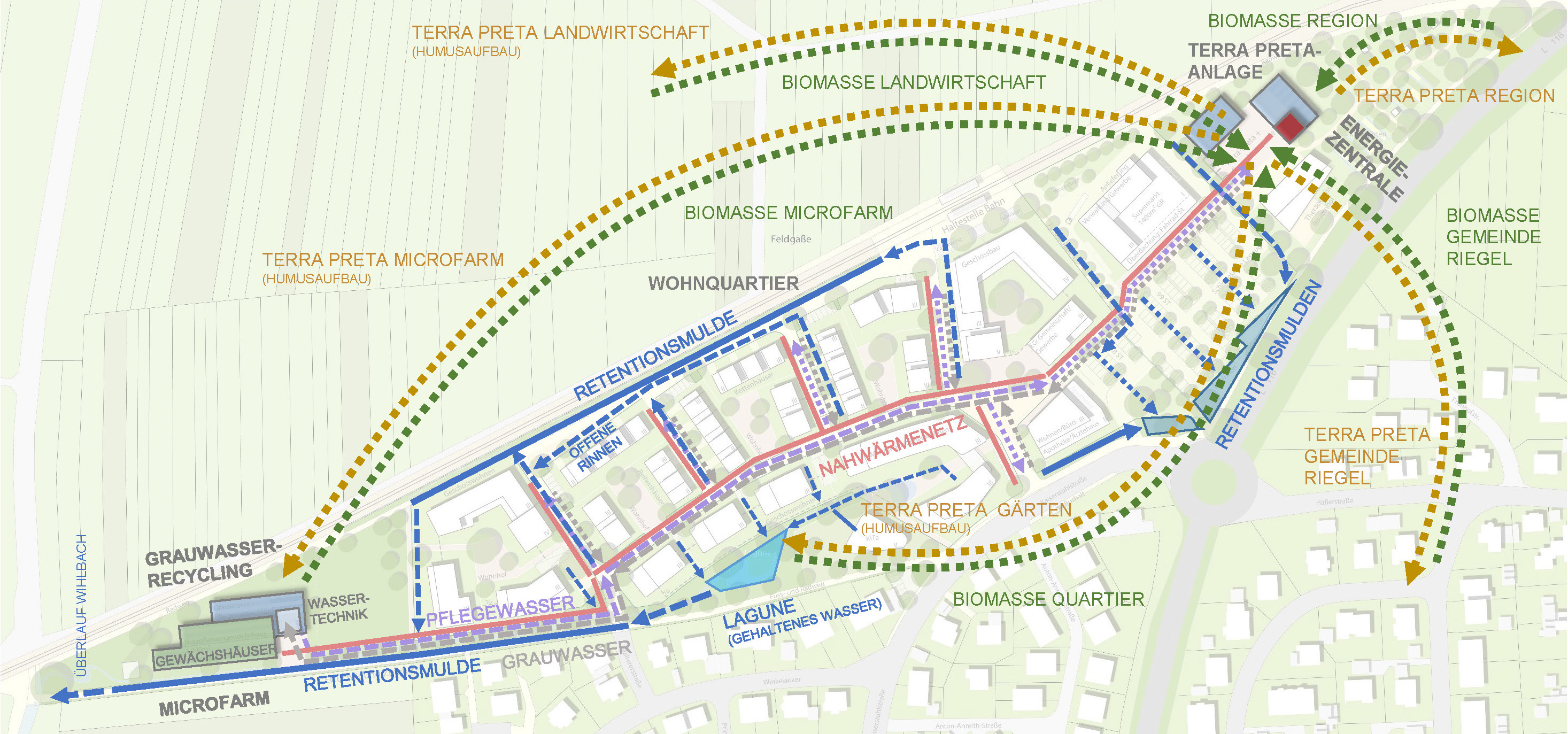 Municipalities wishing to develop residential and commercial areas can use the ricionoase21 approach to take new, forward-looking paths towards comprehensive climate and resource protection and flood prevention. Through individual overall planning, biogenic waste materials and wastewater are processed in a decentralized manner and used to generate energy, process water and terra products. This transformation creates considerable local added value, in which municipalities and citizens can participate in many cases.